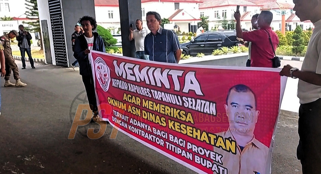 //portalsumuttabagsel.com||- Puluhan massa DPD Waktu Indonesia Bergerak (WIB) jilid II menggelar demonstrasi di depan kantor Bupati Tapanuli Selatan dan Dinas Kesehatan pada Selasa (21/10/2025). Aksi ini menuntut Bupati untuk mencopot oknum sekretaris dinas kesehatan yang diduga terlibat dalam praktik monopoli proyek di lingkungan dinas tersebut.