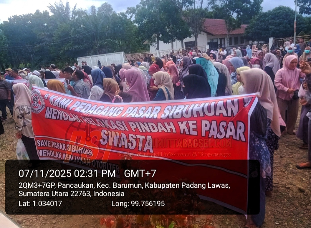 //portalsumuttabagsel.com||- Ratusan Pedagang Pasar Sibuhuan Unjuk Rasa Di Kantor DPRD Kabupaten Padang Lawas Tolak Perpindahan Pasar Sibuhuan Ke pasar Baru, Jum’at (7/11/2025)